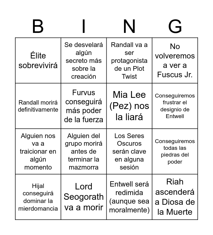 This bingo card has 16 words: Lord Seogorath va a morir, Conseguiremos todas las piedras del poder, Randall va a ser protagonista de un Plot Twist, Élite sobrevivirá, Alguien nos va a traicionar en algún momento, Se desvelará algún secreto más sobre la creación, Los Seres Oscuros serán clave en alguna sesión, Entwell será redimida (aunque sea moralmente), Randall morirá definitivamente, Furvus conseguirá más poder de la fuerza, Hijal conseguirá dominar la mierdomancia, No volveremos a ver a Fuscus Jr., Alguien del grupo morirá antes de terminar la mazmorra, Conseguiremos frustrar el designio de Entwell, Mia Lee (Pez) nos la liará and Riah ascenderá a Diosa de la Muerte.
