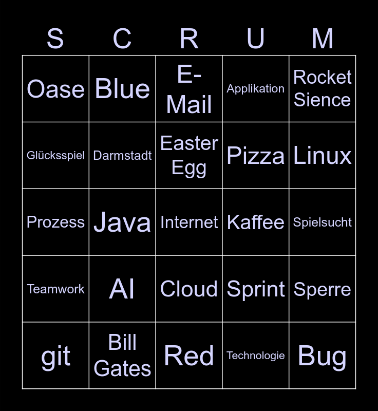 This bingo card has a free space and 24 words: AI, Bill Gates, Easter Egg, git, Rocket Sience, Oase, Glücksspiel, Blue, Kaffee, Cloud, Pizza, Prozess, Sprint, Sperre, Darmstadt, Technologie, Spielsucht, E-Mail, Linux, Java, Bug, Teamwork, Applikation and Red.