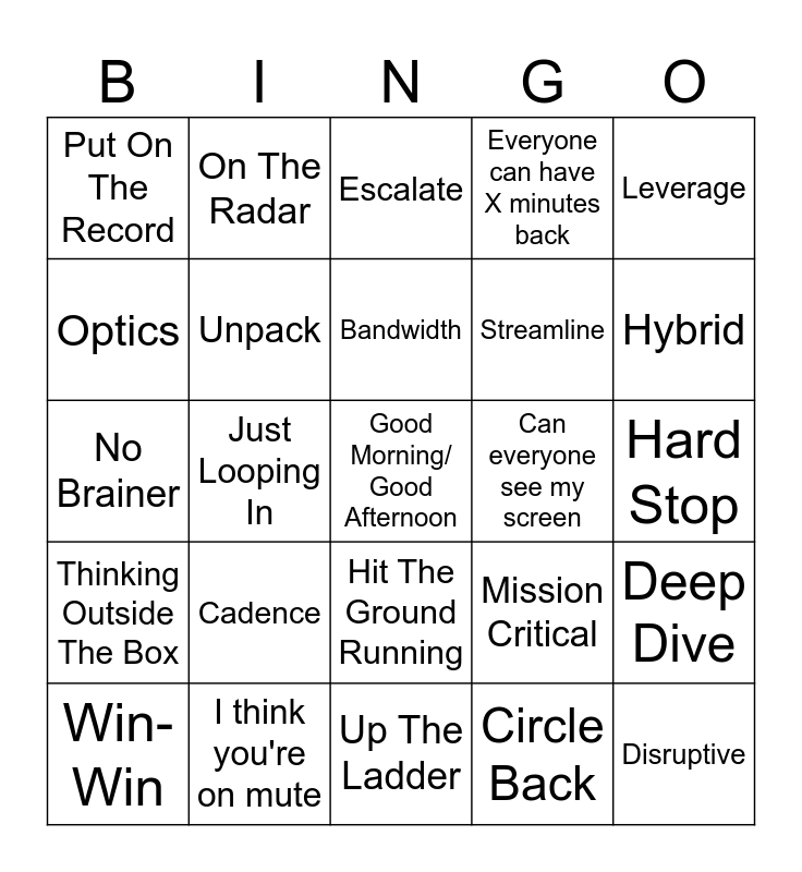 This bingo card has a free space and 42 words: Alignment, Bandwidth, Bang For Your Buck, Cadence, Circle Back, Deep Dive, Disruptive, Deal Breaker, Escalate, Hit The Ground Running, Hard Stop, Hybrid, Just Looping In, Leverage, Low Hanging Fruit, Mission Critical, Moving Parts, No Brainer, Offload, On The Radar, Optics, Pain Points, Pivot, Put On The Record, Quick Win, Reinvent The Wheel, Streamline, Synergy, Take This Offline, The Bottom Line, There Seems To Be A Disconnect, Thinking Outside The Box, Unpack, Up The Ladder, Wheelhouse, Win-Win, I think you're on mute, Can everyone see my screen, Happy Friday, Happy New Month, Everyone can have X minutes back and Parking Lot.