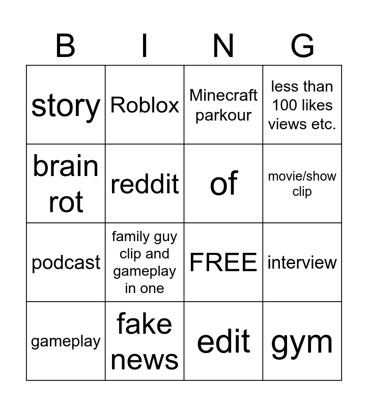 This bingo card has 16 words: fake news, interview, Minecraft parkour, story, podcast, Roblox, FREE, edit, brain rot, reddit, gameplay, less than 100 likes views etc., family guy clip and gameplay in one, movie/show clip, of and gym.