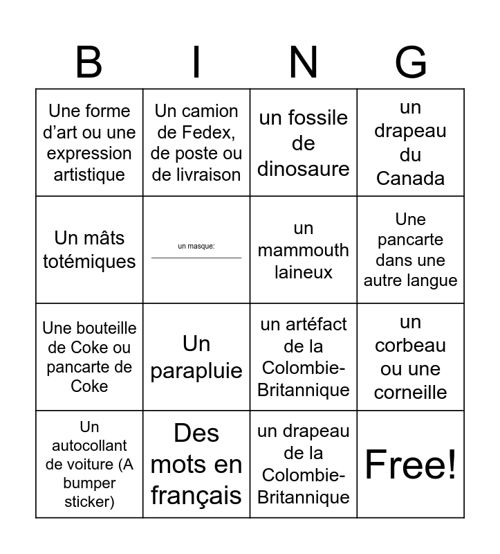 This bingo card has 23 words: Free!, Deux mouettes ou deux pigeons, Une pancarte dans une autre langue, Une sculpture ou un monument historique, Un mâts totémiques, Une forme d’art ou une expression artistique, un masque: _______________________, Un camion de Fedex, de poste ou de livraison, Un autocollant de voiture (A bumper sticker), Un vélo, Un parapluie, Une bouteille de Coke ou pancarte de Coke, Une fontaine à eau, Une carte de la Colombie-Britannique, Des mots en français, Une photos d’une baleine, un fossile de dinosaure, un artéfact de la Colombie-Britannique, un mammouth laineux, un corbeau ou une corneille, un drapeau du Canada, un drapeau de la Colombie-Britannique and un cougar.