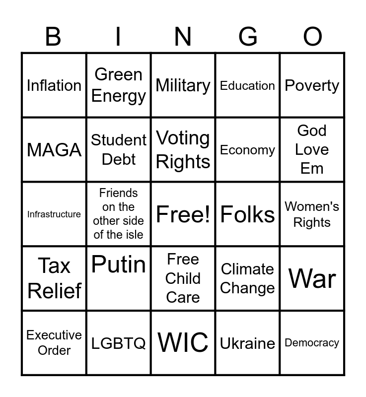 This bingo card has a free space and 24 words: Putin, LGBTQ, Voting Rights, Executive Order, Poverty, Inflation, MAGA, Green Energy, Folks, Free Child Care, Economy, Infrastructure, Climate Change, War, Student Debt, Ukraine, Women's Rights, Military, God Love Em, Friends on the other side of the isle, Democracy, Tax Relief, Education and WIC.
