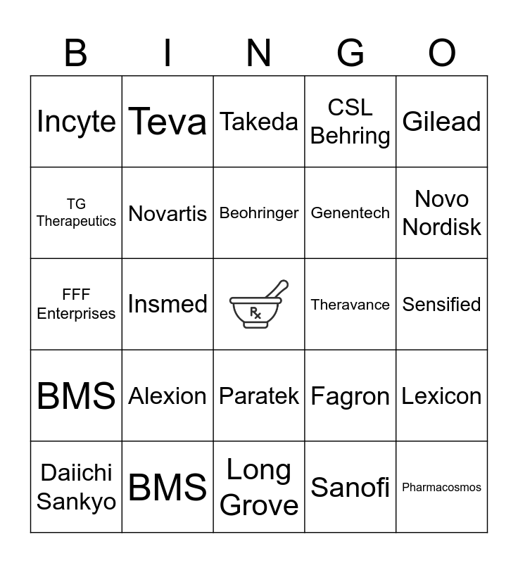 This bingo card has a free space and 24 words: Alexion, BMS, Beohringer, Daiichi Sankyo, Gilead, Incyte, TG Therapeutics, Teva, Theravance, Paratek, Genentech, FFF Enterprises, Fagron, Lexicon, Novartis, Sanofi, Sensified, Takeda, Novo Nordisk, Insmed, Pharmacosmos, BMS, CSL Behring and Long Grove.