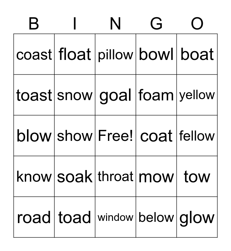 This bingo card has a free space and 24 words: soak, toad, goal, road, boat, coast, toast, float, coat, throat, foam, blow, mow, tow, snow, below, fellow, pillow, yellow, show, glow, know, bowl and window.
