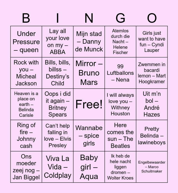 This bingo card has a free space and 30 words: Viva La Vida – Coldplay, Single ladies – Beyoncé, Oops i did it again – Britney Spears, Money, money, money – ABBA, Under Pressure – queen, Mijn stad – Danny de Munck, Bills, bills, billss – Destiny’s Child, Wannabe – spice girls, I will always love you – Withney Houston, Baby girl – Aqua, Uit m’n bol – André Hazes, Engelbewaarder – Marco Schuitmaker, Ik heb de hele nacht liggen dromen – Wolter Kroes, Leef nu het kan – Jan Smit, Zwemmen in bacardi lemon – Mart Hoogkramer, Noodgeval – Goldband, Here comes the sun – The Beatles, Ring of fire – Johnny cash, Can’t help falling in love – Elvis Presley, Girls just want to have fun – Cyndi Lauper, Heaven is a place on earth – Belinda Carisle, Island in the stream – Dolly Parton, Lay all your love on my – ABBA, 99 Luftballons – Nena, Rock with you – Micheal Jackson, Atemlos durch die Nacht – Helene Fischer, Pretty Belinda – lawineboys, Ons moeder zeej nog – Jan Biggel, Mirror – Bruno Mars and Tonight – Son Mieux.