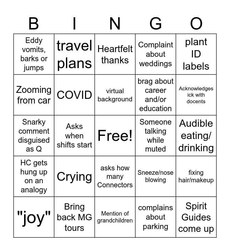 This bingo card has a free space and 24 words: Crying, Bring back MG tours, virtual background, "joy", plant ID labels, Eddy vomits, barks or jumps, Zooming from car, travel plans, Someone talking while muted, asks how many Connectors, brag about career and/or education, Snarky comment disguised as Q, Sneeze/nose blowing, fixing hair/makeup, COVID, complains about parking, Audible eating/ drinking, Heartfelt thanks, Acknowledges ick with docents, Asks when shifts start, Spirit Guides come up, HC gets hung up on an analogy, Complaint about weddings and Mention of grandchildren.