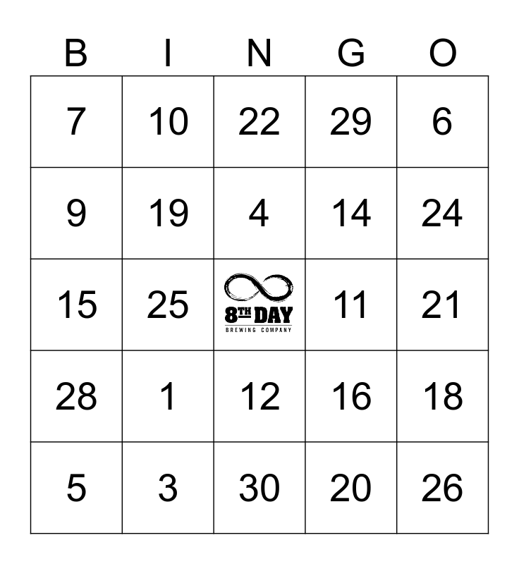 This bingo card has a free space and 24 words: 1, 3, 4, 5, 6, 7, 9, 10, 11, 12, 14, 15, 16, 18, 19, 20, 21, 22, 24, 25, 26, 28, 29 and 30.