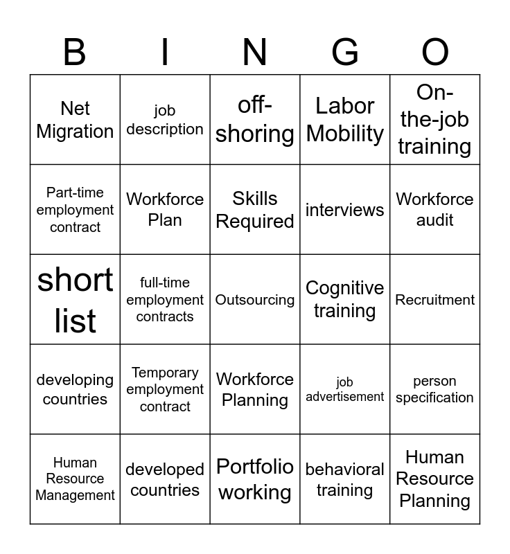 This bingo card has a free space and 24 words: Temporary employment contract, developed countries, Skills Required, Human Resource Management, On-the-job training, Net Migration, Part-time employment contract, job description, Cognitive training, Workforce Planning, interviews, short list, job advertisement, person specification, Workforce Plan, behavioral training, Recruitment, off-shoring, Workforce audit, full-time employment contracts, Human Resource Planning, developing countries, Labor Mobility and Portfolio working.