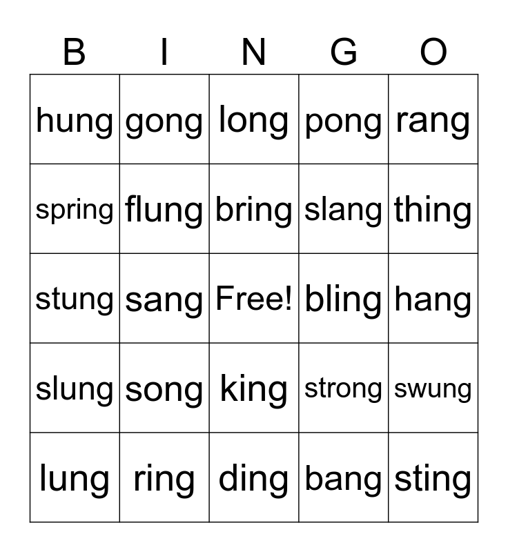 This bingo card has a free space and 24 words: song, ring, bring, lung, rang, hung, spring, gong, bling, king, slang, stung, strong, swung, flung, bang, hang, long, thing, sang, sting, slung, pong and ding.