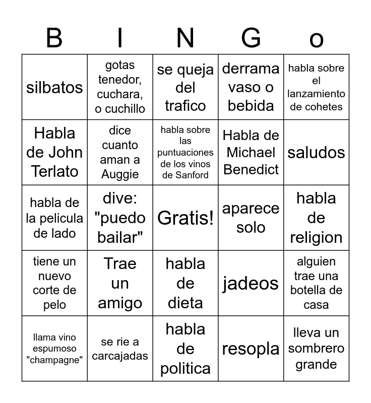 This bingo card has a free space and 29 words: llama vino espumoso "champagne", cita una pelicula, dive: "puedo bailar", choca esos cinco con la mano, silbatos, se queja del trafico, dice cuanto aman a Auggie, Trae un amigo, aparece solo, se rie a carcajadas, habla de religion, lleva un sombrero grande, habla de politica, resopla, saludos, trae alergias, habla de dieta, tiene un nuevo corte de pelo, habla sobre el lanzamiento de cohetes, habla de la pelicula de lado, jadeos, habla de Richard Sanford, Habla de Michael Benedict, Habla de John Terlato, derrama vaso o bebida, gotas tenedor, cuchara, o cuchillo, alguien trae una botella de casa, habla sobre las puntuaciones de los vinos de Sanford and habla de premion de la rifa.