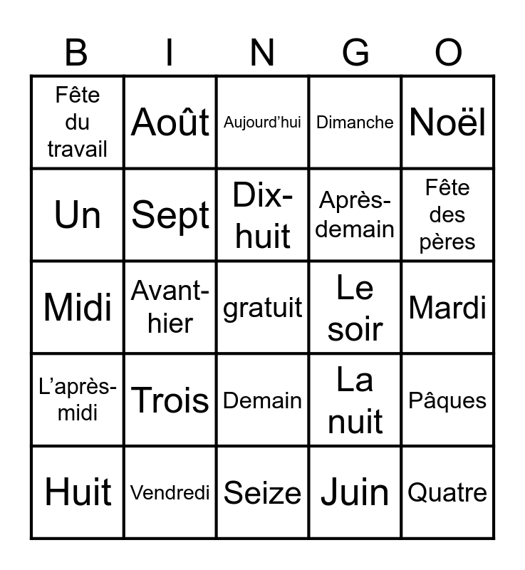 This bingo card has a free space and 70 words: Lundi, Mardi, Mercredi, Jeudi, Vendredi, Samedi, Dimanche, Jour de l’An, Noël, Halloween, Pâques, Fête des mères, Fête du travail, Aujourd’hui, Hier, Avant-hier, Demain, Après-demain, Le matin, L’après-midi, Le soir, La nuit, Fête des pères, Janvier, Février, Mars, Avril, Mai, Juin, Juillet, Août, Septembre, Octobre, Novembre, Décembre, L’été, Le printemps, L’automne, L’hiver, Un, Deux, Trois, Quatre, Cinq, Six, Sept, Huit, Neuf, Dix, Onze, Douze, Treize, Quatorze, Quinze, Seize, Dix-sept, Dix-huit, Dix-neuf, Vingt, L’heure, Midi, Minuit, Un téléphone, Un cellulaire, La boîte vocale, Le répondeur, Les écouteurs, Le bottin, L’annuaire and Le message.