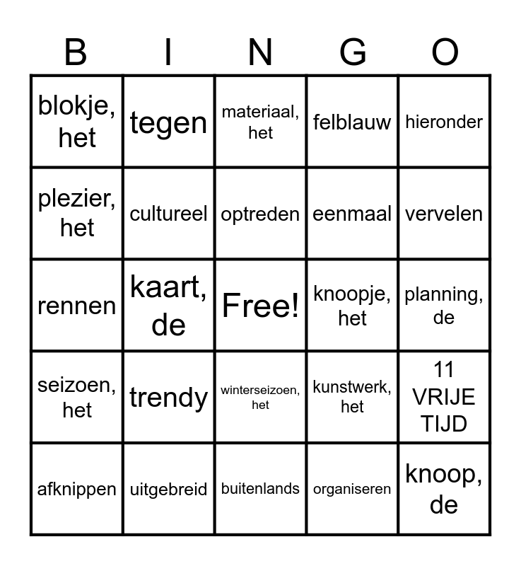 This bingo card has a free space and 55 words: activiteit, de, afknippen, bereid, blokje, het, buitenlands, chips, de, cultureel, diner, het, eenmaal, fel, felblauw, felroze, filmster, de, genieten, gymdocent, de, gymles, de, hieronder, kaart, de, knippen, knoop, de, knoopje, het, korps, het, kunstwerk, het, materiaal, het, noodzakelijk, optreden, organiseren, outfit, de, planning, de, 11 VRIJE TIJD, Woordenlijst DISK © Boom uitgevers Amsterdam, 2022, WOORD VERTALING, Halfgevorderd, plek, de, plezier, het, rennen, rondje, het, seizoen, het, spel, het, surfen, tegen, tennisser, de, terecht, tiental, het, trendy, uitgebreid, verdelen, versieren, vervangen, vervelen, verveling, de, verven, voorlezen, winterseizoen, het and zomervakantie, de.