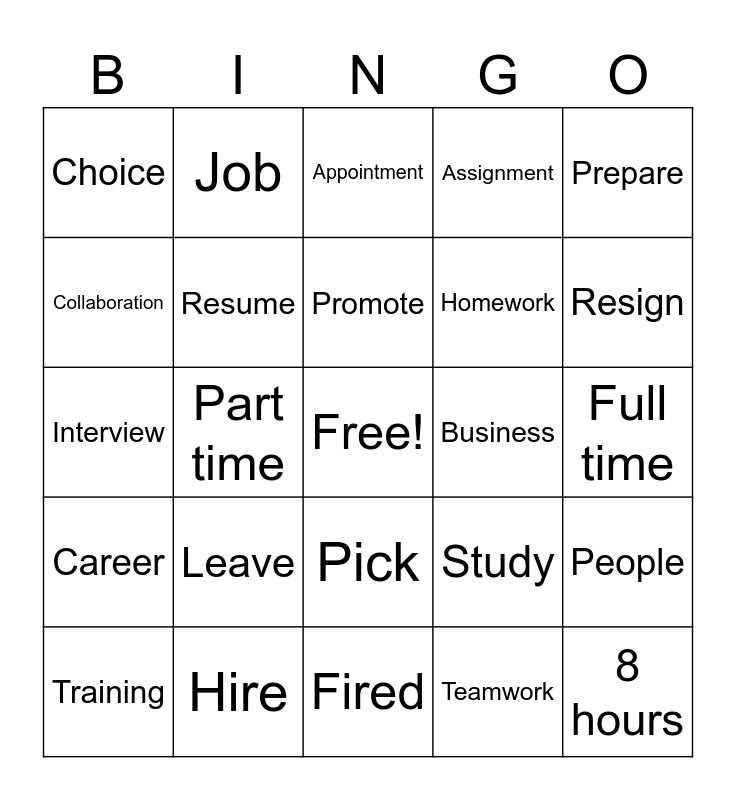 This bingo card has a free space and 28 words: People, Work, Homework, Teamwork, Collaboration, Appointment, Job, Career, Business, Training, Interview, Assignment, Hire, Fired, Resign, Quit, Leave, Resume, Promote, Pick, Choice, Arrive, 8 hours, Part time, Full time, Study, Prepare and Experience.