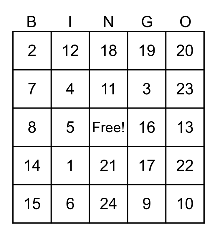 This bingo card has a free space and 24 words: 1, 6, 11, 15, 20, 2, 7, 12, 16, 21, 3, 8, 17, 22, 4, 9, 13, 18, 23, 5, 10, 14, 19 and 24.