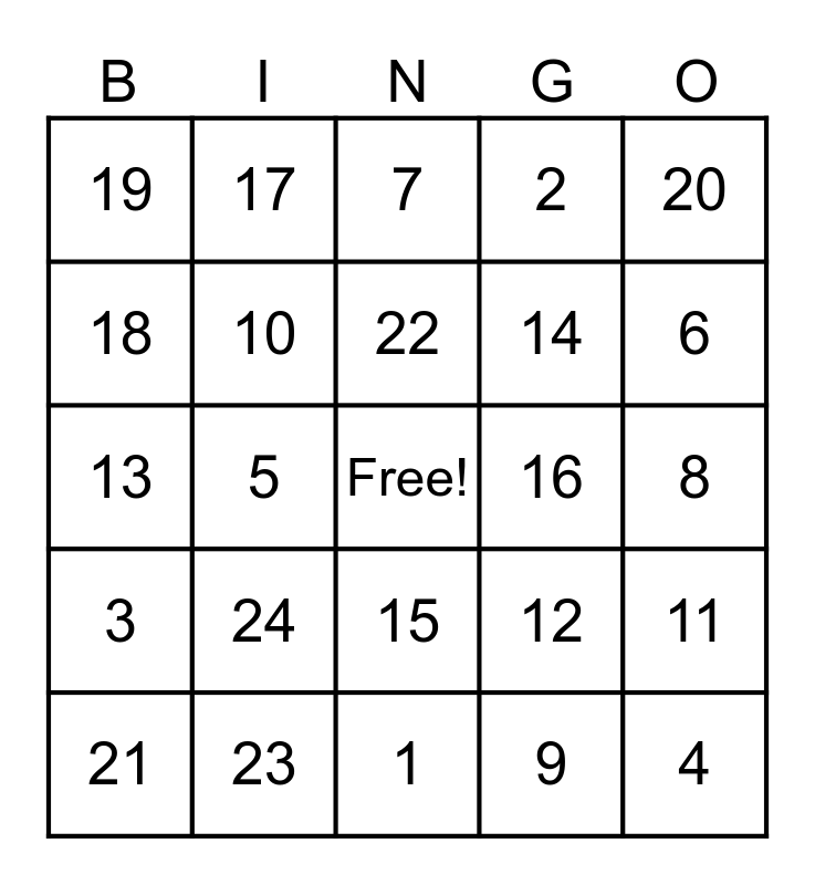 This bingo card has a free space and 24 words: 24, 23, 22, 21, 20, 19, 18, 17, 16, 15, 14, 13, 12, 11, 10, 9, 8, 7, 6, 5, 4, 3, 2 and 1.