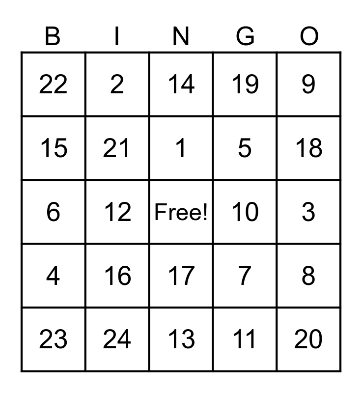 This bingo card has a free space and 24 words: 16, 24, 1, 23, 9, 22, 15, 2, 10, 17, 5, 6, 7, 8, 21, 11, 3, 14, 18, 12, 20, 4, 19 and 13.