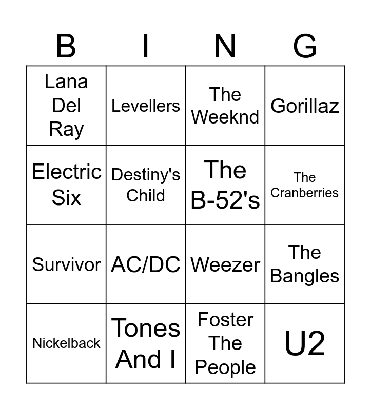 This bingo card has 30 words: Fifth Harmony, Arctic Monkeys, The Bangles, Ed Sheeran, Lana Del Ray, The Weeknd, The B-52's, Coldplay, Tones And I, Maroon 5, Foster The People, Nickelback, The Script, Gavin DeGraw, AC/DC, The Monkees, David Bowie, U2, Miley Cyrus, WATT, Elton John, Electric Six, Weezer, Buddy Holly, Levellers, Survivor, Destiny's Child, Gorillaz, Lynyrd Skynyrd, The Smashing Pumpkins, The Cranberries and Oasis.