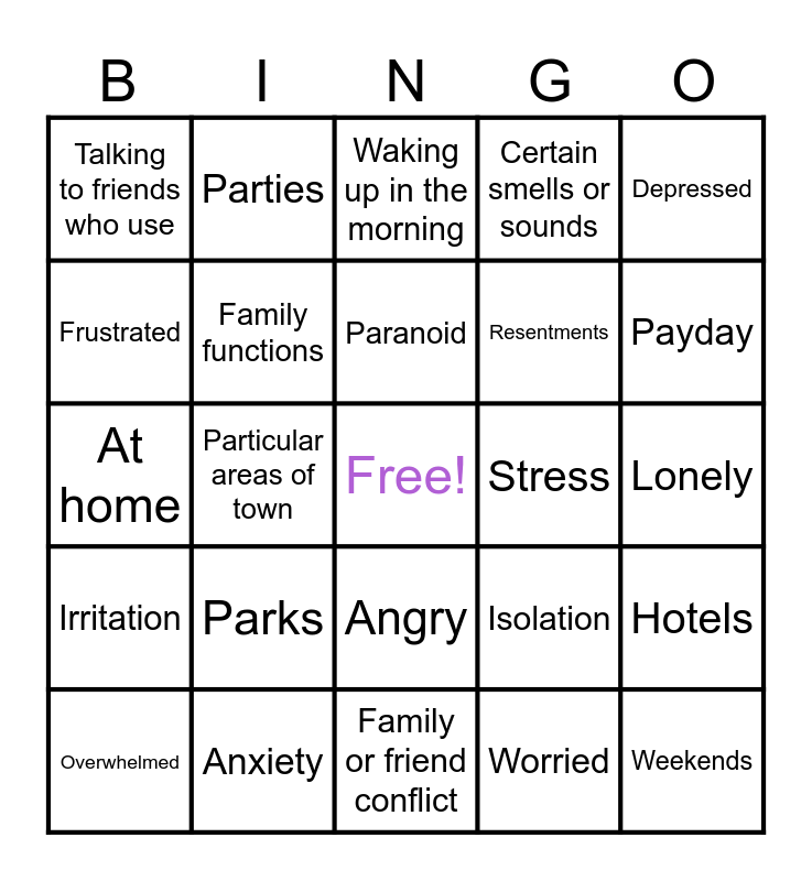 This bingo card has a free space and 24 words: Parks, Anxiety, Paranoid, Overwhelmed, Depressed, Talking to friends who use, Frustrated, Parties, Stress, Angry, Resentments, At home, Isolation, Hotels, Family functions, Worried, Lonely, Waking up in the morning, Payday, Particular areas of town, Weekends, Irritation, Certain smells or sounds and Family or friend conflict.