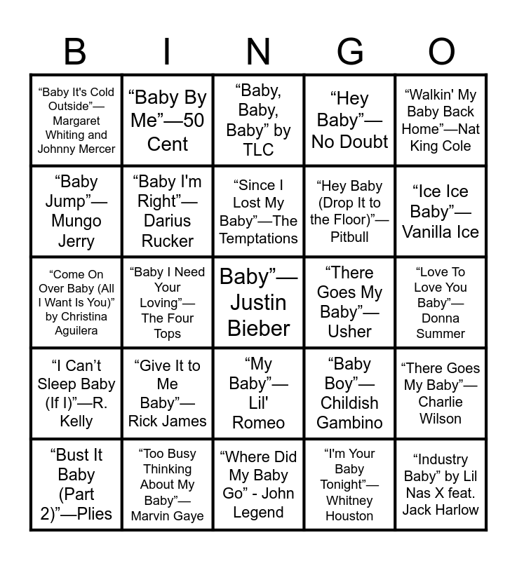 This bingo card has 47 words: Free!, Baby”—Justin Bieber, “Baby, I Love Your Way” -Peter Frampton, “Where Did My Baby Go” - John Legend, “Give It to Me Baby”—Rick James, “Runaway Baby”—Bruno Mars, “Baby By Me”—50 Cent, “Always Be My Baby”—Mariah Carey, “Baby Jump”—Mungo Jerry, “Baby Boy”—Beyoncé, “Baby I'm Right”—Darius Rucker, “Hey Baby”—No Doubt, “There Goes My Baby”—Charlie Wilson, “Baby Boy”—Childish Gambino, “Cry Baby”—Melanie Martinez, “Baby Come Back”—Player, “Since I Lost My Baby”—The Temptations, “There Goes My Baby”—Usher, “Baby”—LL Cool J, “Walkin' My Baby Back Home”—Nat King Cole, “Baby I Need Your Loving”—The Four Tops, “I'm Your Baby Tonight”—Whitney Houston, “Baby It's Cold Outside”—Margaret Whiting and Johnny Mercer, “Hey Baby (Drop It to the Floor)”—Pitbull, “Baby Love”—The Supremes, “Ice Ice Baby”—Vanilla Ice, “Bust It Baby (Part 2)”—Plies, “Santa Baby”—Eartha Kitt, “My Baby”—Lil' Romeo, “I Can’t Sleep Baby (If I)”—R. Kelly, “...Baby One More Time”—Britney Spears, “Baby Got Back”—Sir Mix-A-Lot, “Baby Be Mine”—Michael Jackson, "Baby Mama"—Brandy featuring Chance the Rapper, “Industry Baby”—Lil Nas X and Jack Harlow, “Too Busy Thinking About My Baby”—Marvin Gaye, “Love To Love You Baby”—Donna Summer, “Brenda’s Got a Baby”—Tupac Shakur, “Cry Baby”—Cee Lo Green, “Rock Wit U (Awww Baby)” by Ashanti, “Industry Baby” by Lil Nas X feat. Jack Harlow, “Baby, Baby, Baby” by TLC, “Come On Over Baby (All I Want Is You)” by Christina Aguilera, “Baby” by Brandy, “Shea Butter Baby” by Ari Lennox feat. J. Cole, “Hey Baby (Drop It to the Floor)” by Pitbull feat. T-Pain and “Do Me, Baby” by Prince.