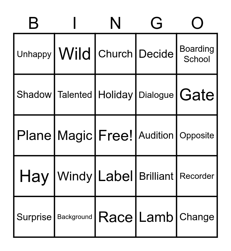 This bingo card has a free space and 25 words: Windy, Race, Holiday, Surprise, Boarding School, Unhappy, Shadow, Wild, Audition, Label, Dialogue, Plane, Brilliant, Recorder, Talented, Stall, Opposite, Church, Gate, Magic, Change, Background, Hay, Decide and Lamb.