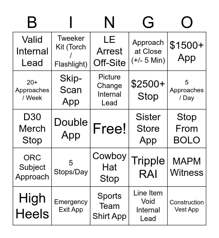 This bingo card has a free space and 24 words: 5 Stops/Day, Emergency Exit App, Picture Change Internal Lead, High Heels, $1500+ App, Valid Internal Lead, 20+ Approaches / Week, Tweeker Kit (Torch / Flashlight), Sister Store App, Cowboy Hat Stop, $2500+ Stop, D30 Merch Stop, Tripple RAI, MAPM Witness, Skip-Scan App, Line Item Void Internal Lead, Stop From BOLO, LE Arrest Off-Site, 5 Approaches / Day, Double App, Construction Vest App, ORC Subject Approach, Approach at Close (+/- 5 Min) and Sports Team Shirt App.