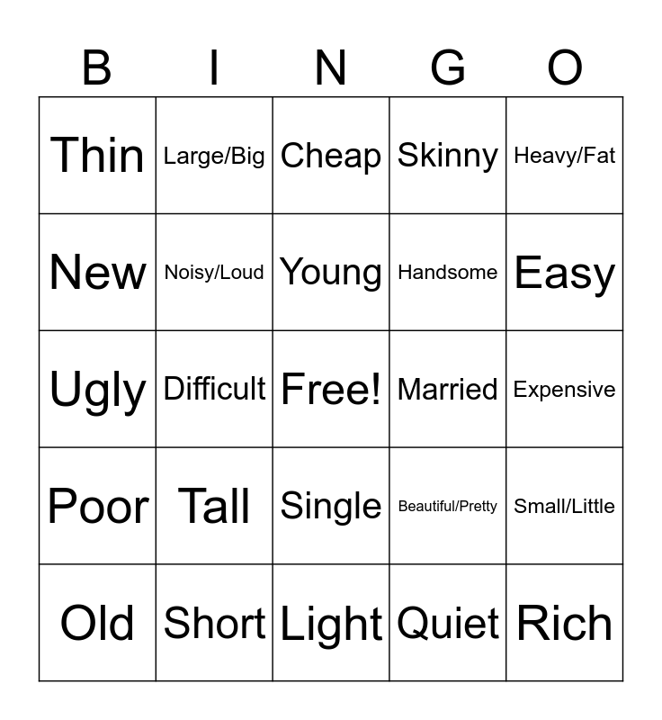 This bingo card has a free space and 24 words: Tall, Short, Young, Old, Heavy/Fat, Thin, New, Large/Big, Married, Single, Handsome, Ugly, Beautiful/Pretty, Small/Little, Noisy/Loud, Quiet, Expensive, Cheap, Easy, Difficult, Rich, Poor, Skinny and Light.