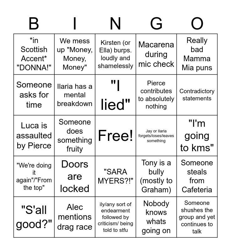 This bingo card has a free space and 24 words: Doors are locked, Alec mentions drag race, "I lied", "S'all good?", Really bad Mamma Mia puns, *in Scottish Accent* "DONNA!", Someone asks for time, We mess up "Money, Money, Money", Jay or Ilaria forgets/loses/leaves something, "SARA MYERS?!", Pierce contributes to absolutely nothing, Luca is assaulted by Pierce, Tony is a bully (mostly to Graham), Someone steals from Cafeteria, Ilaria has a mental breakdown, Nobody knows whats going on, "I'm going to kms", Kirsten (or Ella) burps. loudly and shamelessly, Contradictory statements, Someone does something fruity, Someone shushes the group and yet continues to talk, "We're doing it again"/"From the top", Macarena during mic check and ily/any sort of endearment followed by criticism/ being told to stfu.