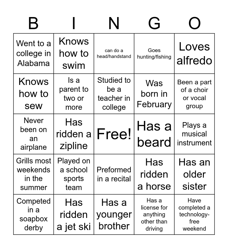 This bingo card has a free space and 25 words: Played on a school sports team, Has a younger brother, Studied to be a teacher in college, Competed in a soapbox derby, Loves alfredo, Went to a college in Alabama, Knows how to sew, Knows how to swim, Has a beard, Preformed in a recital, Was born in February, Never been on an airplane, Has ridden a horse, Has an older sister, Is a parent to two or more, Rides a motorcycle, Plays a musical instrument, can do a head/handstand, Been a part of a choir or vocal group, Has ridden a zipline, Have completed a technology-free weekend, Has ridden a jet ski, Grills most weekends in the summer, Goes hunting/fishing and Has a license for anything other than driving.