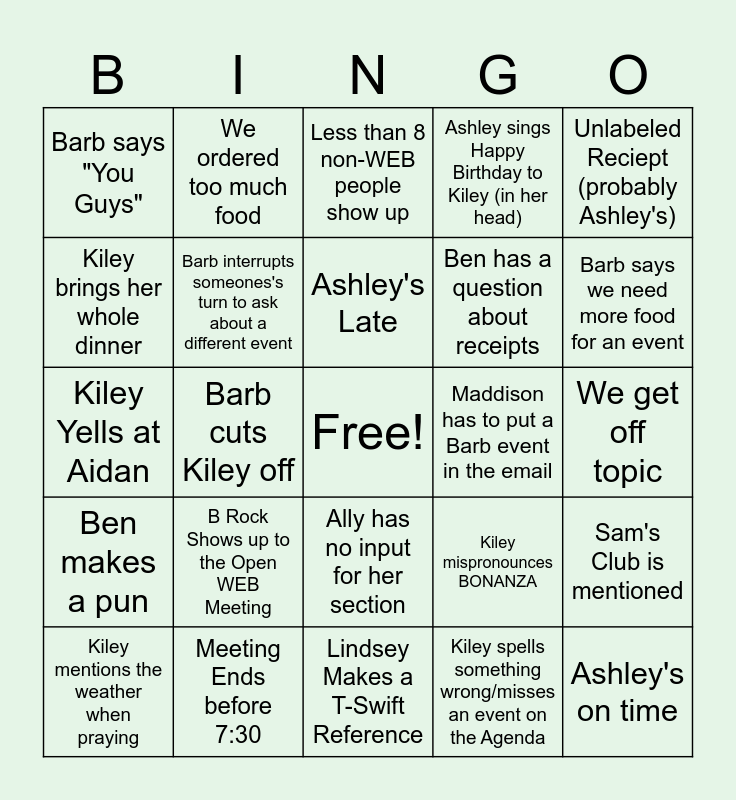 This bingo card has a free space and 24 words: B Rock Shows up to the Open WEB Meeting, Meeting Ends before 7:30, Ashley's Late, Kiley mentions the weather when praying, Unlabeled Reciept (probably Ashley's), Barb says "You Guys", Kiley brings her whole dinner, We ordered too much food, Maddison has to put a Barb event in the email, Ally has no input for her section, Ben has a question about receipts, Kiley Yells at Aidan, Kiley mispronounces BONANZA, Sam's Club is mentioned, Barb interrupts someones's turn to ask about a different event, Kiley spells something wrong/misses an event on the Agenda, We get off topic, Less than 8 non-WEB people show up, Barb says we need more food for an event, Barb cuts Kiley off, Ashley's on time, Ben makes a pun, Ashley sings Happy Birthday to Kiley (in her head) and Lindsey Makes a T-Swift Reference.