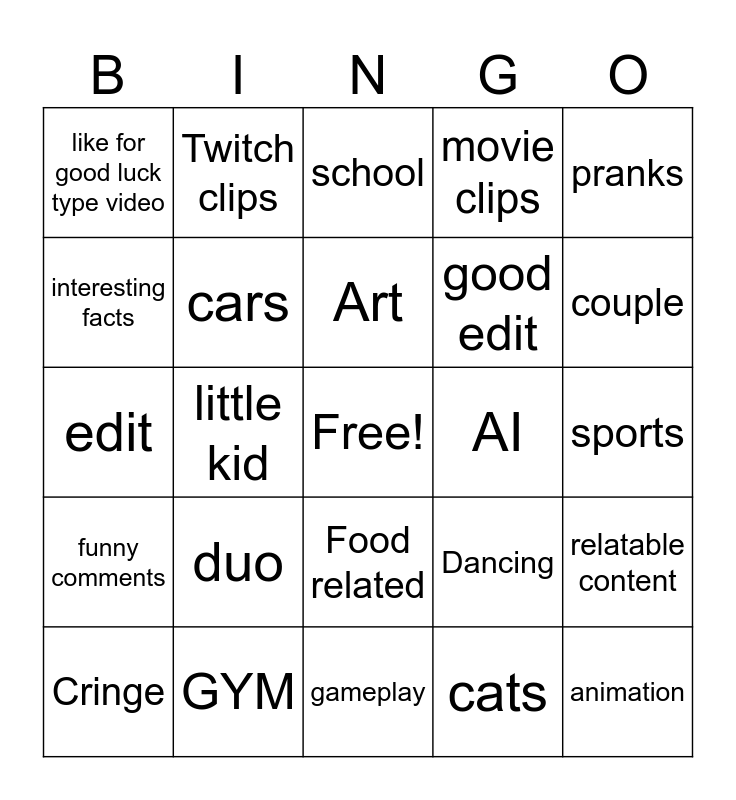 This bingo card has a free space and 24 words: duo, GYM, Art, Cringe, pranks, like for good luck type video, interesting facts, Twitch clips, AI, Food related, good edit, edit, Dancing, relatable content, cars, cats, sports, school, couple, little kid, animation, funny comments, movie clips and gameplay.