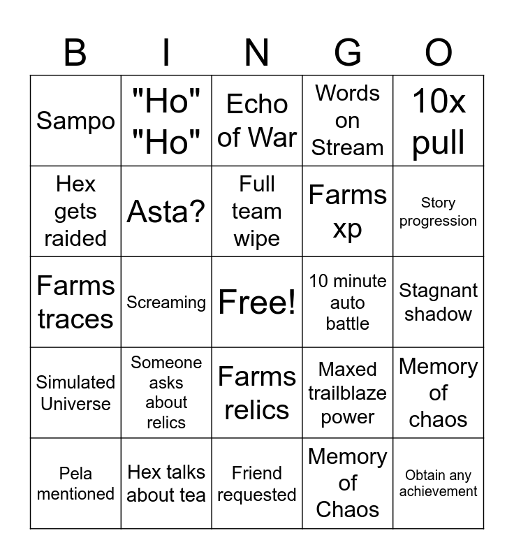 This bingo card has a free space and 24 words: Someone asks about relics, Hex talks about tea, Full team wipe, Pela mentioned, 10x pull, Sampo, Hex gets raided, "Ho" "Ho", 10 minute auto battle, Farms relics, Farms xp, Farms traces, Maxed trailblaze power, Memory of chaos, Asta?, Memory of Chaos, Stagnant shadow, Echo of War, Story progression, Screaming, Obtain any achievement, Simulated Universe, Words on Stream and Friend requested.