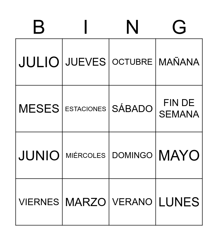 This bingo card has 30 words: INVIERNO, DICIEMBRE, MAYO, AGOSTO, JULIO, OCTUBRE, SÁBADO, ABRIL, MARZO, PRIMAVERA, VERANO, VIERNES, ENERO, FEBRERO, MIÉRCOLES, HOY, SEPTIEMBRE, LUNES, OTOÑO, MESES, DOMINGO, AÑO, JUEVES, JUNIO, ESTACIONES, MAÑANA, NOVIEMBRE, DÍA LABORABLE, FIN DE SEMANA and MARTES.