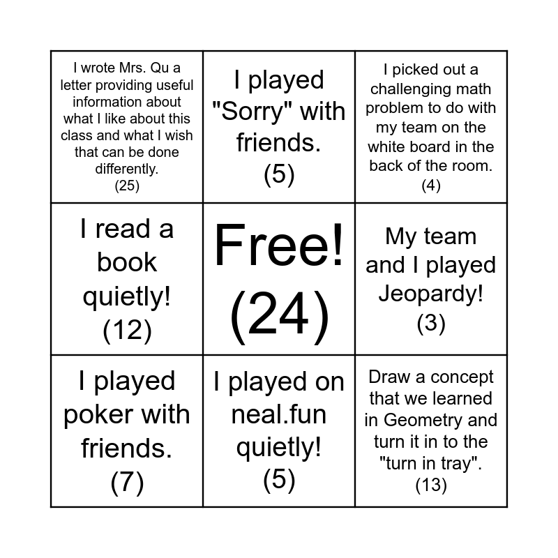 This bingo card has a free space and 8 words: My team and I played Jeopardy! (3), I picked out a challenging math problem to do with my team on the white board in the back of the room. (4), I played "Sorry" with friends. (5), I played poker with friends. (7), I wrote Mrs. Qu a letter providing useful information about what I like about this class and what I wish that can be done differently. (25), Draw a concept that we learned in Geometry and turn it in to the "turn in tray". (13), I read a book quietly! (12) and I played on neal.fun quietly! (5).