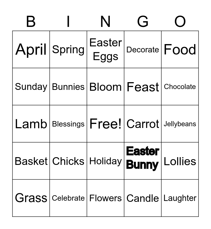 This bingo card has a free space and 27 words: Easter Bunny, Egg Hunt, Feast, Flowers, Sunday, Easter Eggs, Spring, Basket, Carrot, Lollies, Lamb, Decorate, Grass, Celebrate, Chocolate, Family, Bunnies, Bloom, Chicks, April, Jellybeans, Candle, Blessings, Laughter, Holiday, Food and Happy.