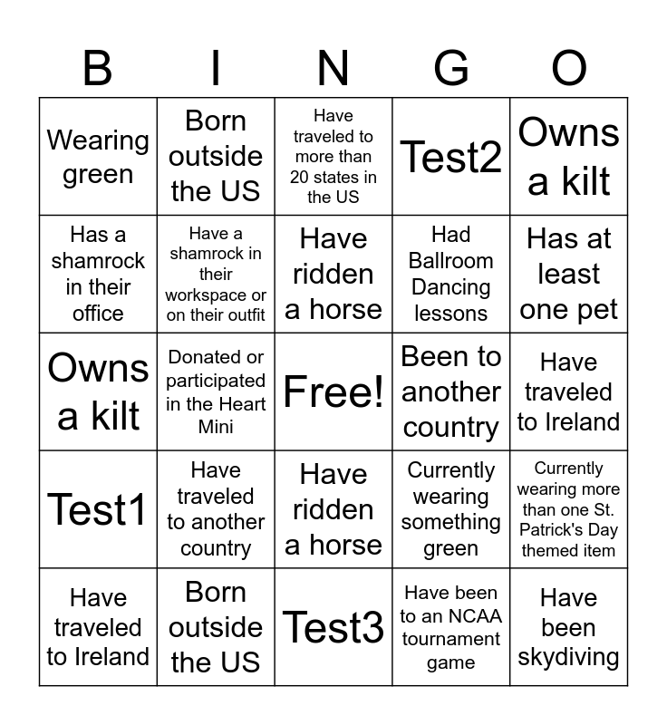This bingo card has a free space and 24 words: Have traveled to another country, Born outside the US, Have ridden a horse, Have traveled to Ireland, Owns a kilt, Wearing green, Has a shamrock in their office, Born outside the US, Been to another country, Have ridden a horse, Had Ballroom Dancing lessons, Owns a kilt, Currently wearing something green, Currently wearing more than one St. Patrick's Day themed item, Have a shamrock in their workspace or on their outfit, Have been to an NCAA tournament game, Have traveled to Ireland, Have traveled to more than 20 states in the US, Has at least one pet, Donated or participated in the Heart Mini, Have been skydiving, Test1, Test2 and Test3.