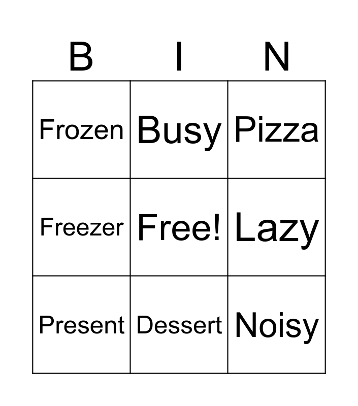 This bingo card has a free space and 9 words: Present, Pizza, Busy, Freezer, Frozen, Lazy, Noisy, Music and Dessert.