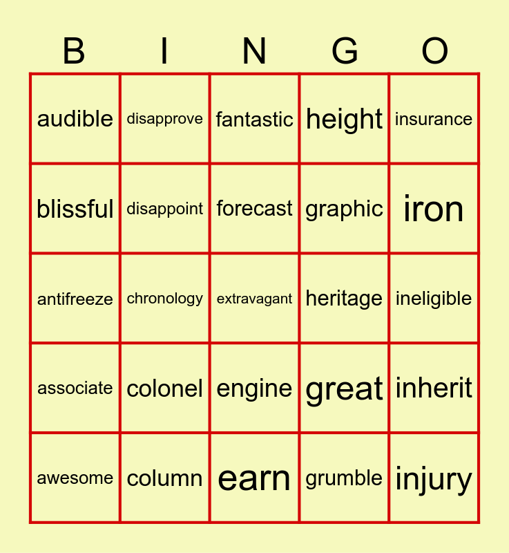 This bingo card has 50 words: allow, column, engage, genuine, ineligible, aerobics, disapprove, environment, graphic, journey, audible, disappoint, extravagant, grumble, jewelry, brilliant, chronology, forecast, hurricane, insurance, antifreeze, cluster, fantastic, heritage, ignore, associate, colonel, foreign, height, inherit, badge, dozen, eager, garage, jealous, awesome, delight, earn, humorous, iron, acquire, deaf, engine, heal, injury, blissful, curious, fond, great and jubilant.