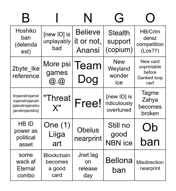 This bingo card has a free space and 24 words: One (1) Liiga art, Blockchain becomes a good card, Team Dog, some wack af Eternal combo, HB/Crim derez competition (Los??), Hoshiko ban (delenda est), 2byte_Ike reference, [new ID] is unplayably bad, [new ID] is ridiculously overtuned, Obelus nearprint, New Weyland wonder ice, trojanstrojanst rojanstrojanstr ojanstrojanstro janstrojanstroj, Still no good NBN ice, Ob ban, More psi games @.@, Bellona ban, Tagme Zahya becomes broken, Believe it or not, Anansi, New card unprintable before Ganked loop nerf, "Threat X", Misdirection nearprint, HB ID power as political asset, Stealth support (copium) and Jnet lag on release day.
