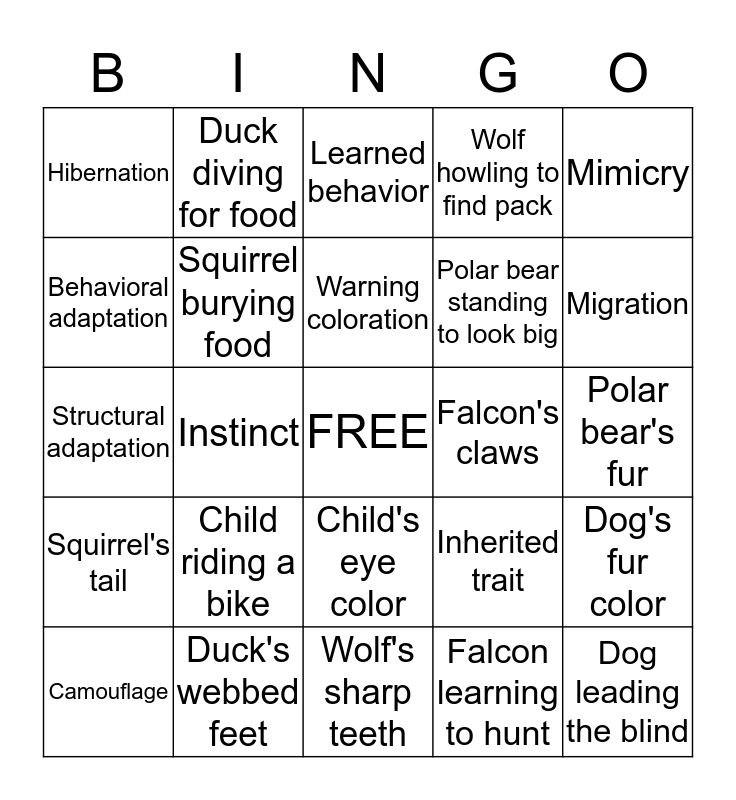 This bingo card has a free space and 24 words: Child riding a bike, Duck's webbed feet, Warning coloration, Camouflage, Mimicry, Hibernation, Behavioral adaptation, Duck diving for food, Falcon's claws, Child's eye color, Polar bear standing to look big, Structural adaptation, Inherited trait, Dog's fur color, Squirrel burying food, Falcon learning to hunt, Polar bear's fur, Learned behavior, Migration, Instinct, Dog leading the blind, Squirrel's tail, Wolf howling to find pack and Wolf's sharp teeth.