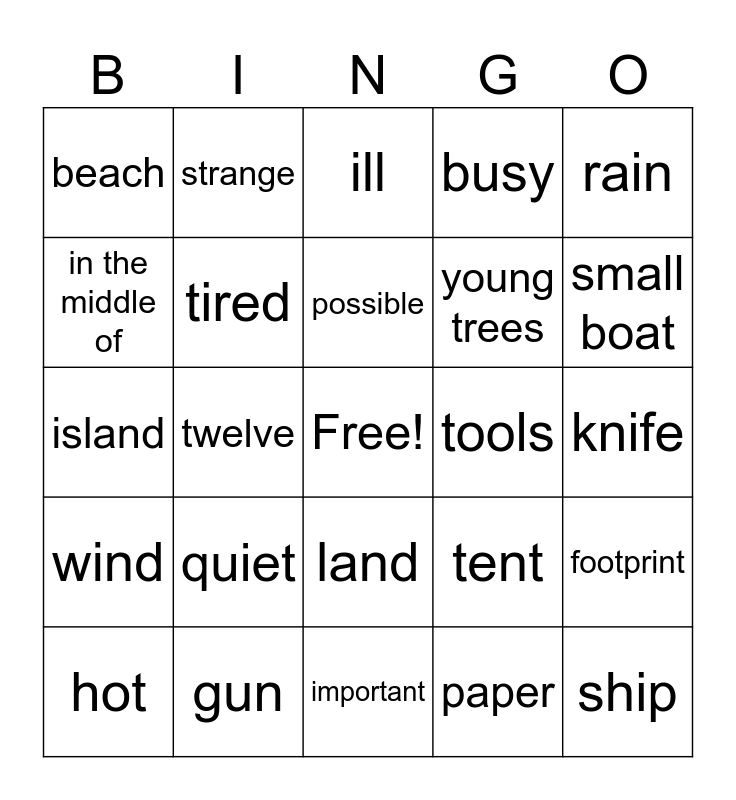 This bingo card has a free space and 29 words: hot, weather, twelve, great storm, beach, ill, tired, quiet, tools, gun, knife, ship, important, paper, small boat, journey, land, wind, rain, island, tent, cave, young trees, in the middle of, busy, strange, footprint, possible and under the sea.