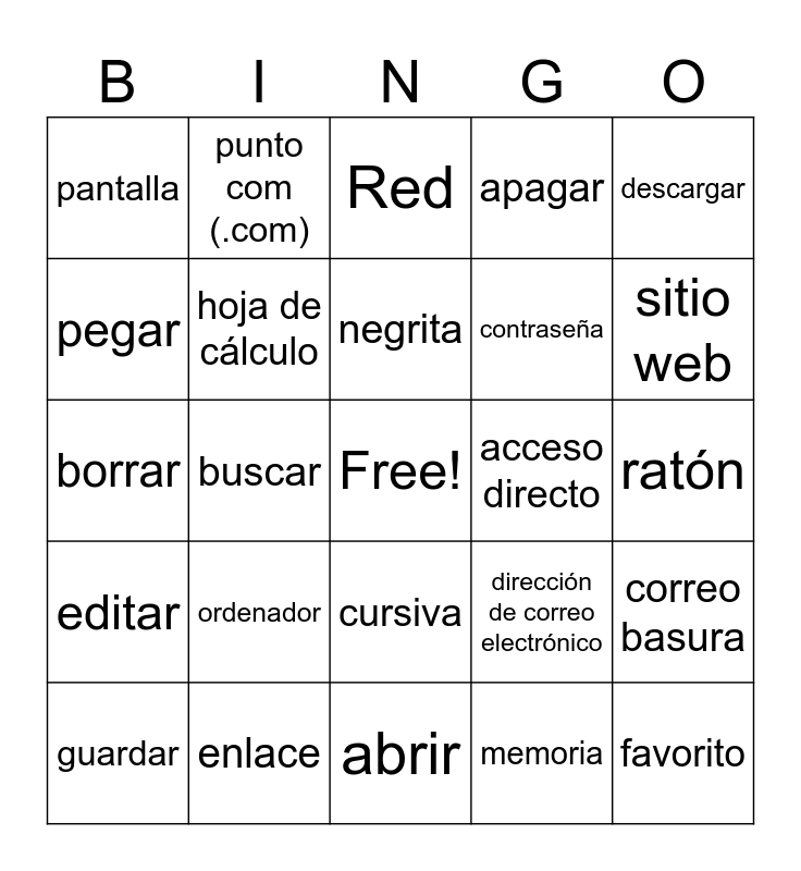 This bingo card has a free space and 24 words: ordenador, enlace, negrita, guardar, descargar, pantalla, pegar, punto com (.com), acceso directo, cursiva, contraseña, borrar, dirección de correo electrónico, correo basura, hoja de cálculo, memoria, ratón, Red, sitio web, buscar, favorito, editar, apagar and abrir.
