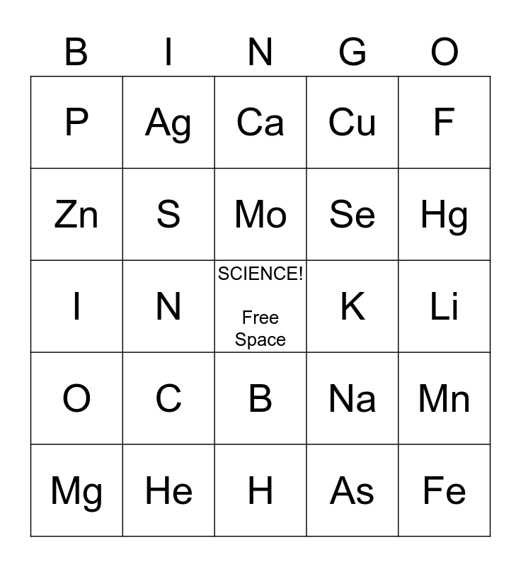 This bingo card has a free space and 29 words: Mg, Si, N, Cl, P, Ca, S, C, K, He, Li, Fe, H, As, Hg, Ne, B, O, F, I, Na, Al, Se, Zn, Cu, Ag, Mn, Mo and Co.