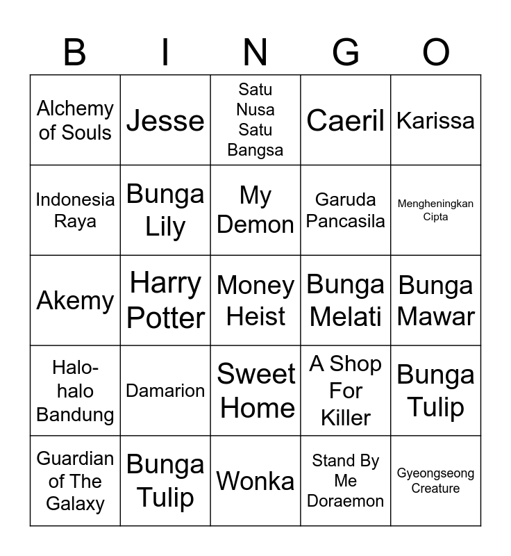 This bingo card has a free space and 24 words: Damarion, Bunga Tulip, My Demon, Guardian of The Galaxy, Karissa, Alchemy of Souls, Indonesia Raya, Jesse, Bunga Melati, Sweet Home, Garuda Pancasila, Akemy, A Shop For Killer, Bunga Tulip, Bunga Lily, Stand By Me Doraemon, Bunga Mawar, Satu Nusa Satu Bangsa, Mengheningkan Cipta, Harry Potter, Gyeongseong Creature, Halo-halo Bandung, Caeril and Wonka.