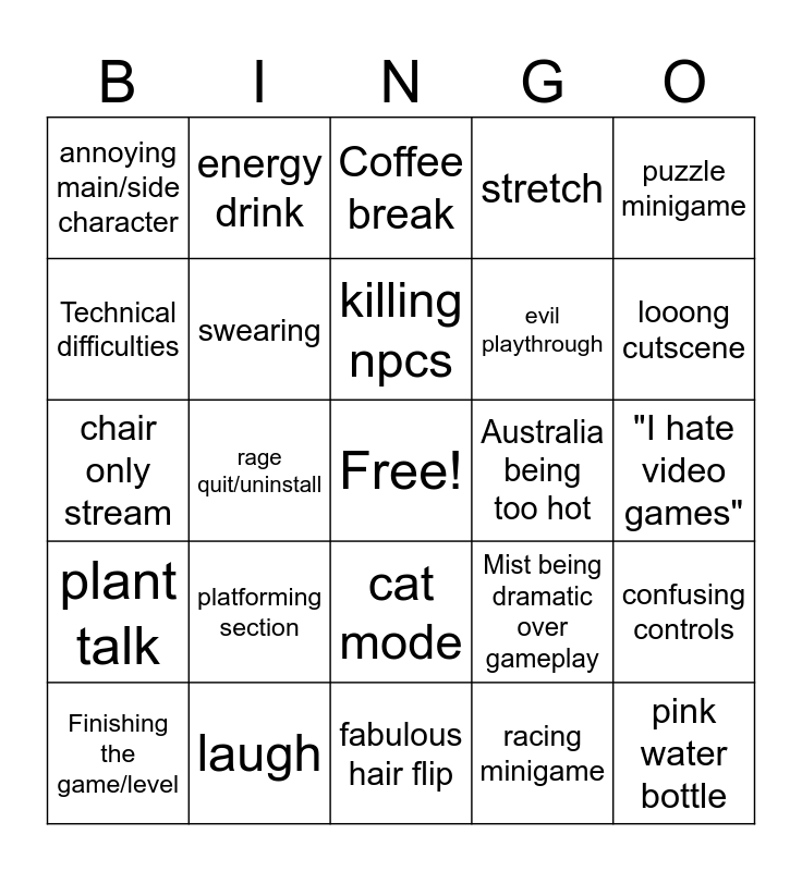 This bingo card has a free space and 25 words: platforming section, fabulous hair flip, killing npcs, Finishing the game/level, puzzle minigame, annoying main/side character, Technical difficulties, energy drink, Australia being too hot, cat mode, evil playthrough, chair only stream, Mist being dramatic over gameplay, confusing controls, swearing, breaking the game, "I hate video games", Coffee break, looong cutscene, rage quit/uninstall, pink water bottle, laugh, plant talk, stretch and racing minigame.