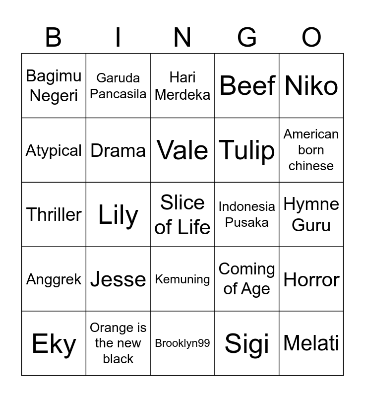 This bingo card has a free space and 24 words: Eky, Jesse, Vale, Sigi, Niko, Bagimu Negeri, Garuda Pancasila, Hari Merdeka, Indonesia Pusaka, Hymne Guru, Thriller, Drama, Coming of Age, Horror, Atypical, Orange is the new black, Brooklyn99, Beef, American born chinese, Anggrek, Lily, Kemuning, Tulip and Melati.