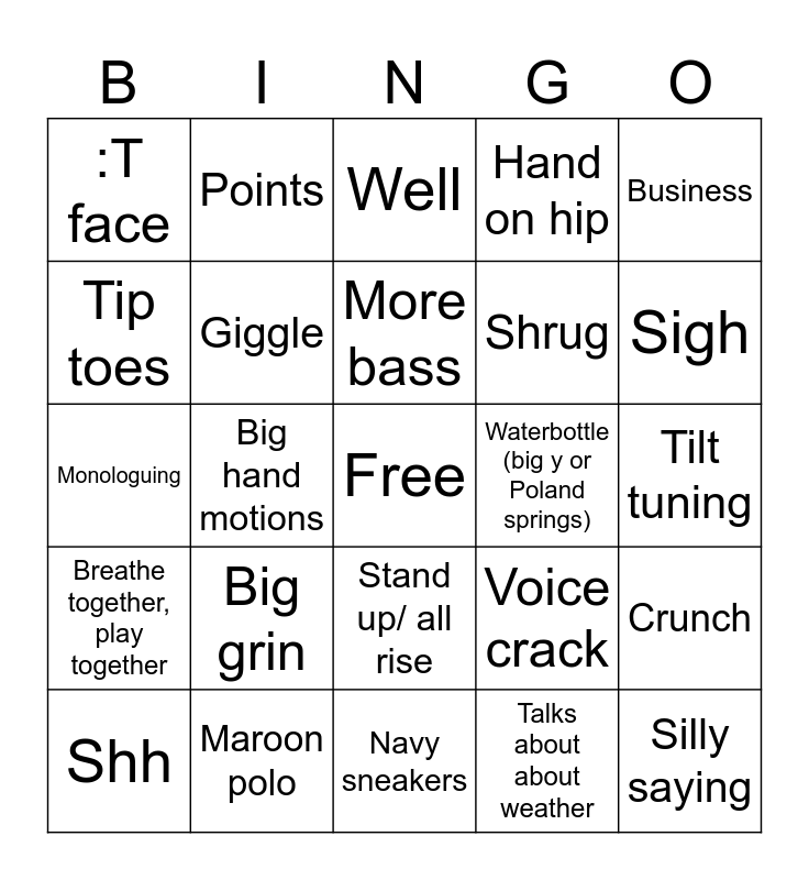 This bingo card has a free space and 24 words: Big grin, Maroon polo, More bass, Shh, Business, :T face, Tip toes, Points, Waterbottle (big y or Poland springs), Stand up/ all rise, Shrug, Monologuing, Voice crack, Crunch, Giggle, Talks about about weather, Tilt tuning, Well, Sigh, Big hand motions, Silly saying, Breathe together, play together, Hand on hip and Navy sneakers.