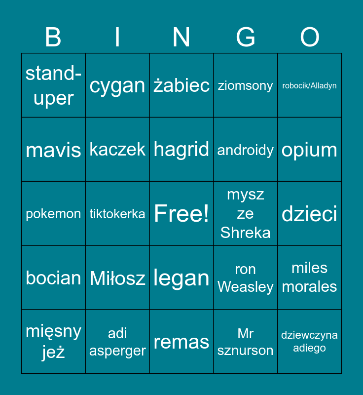 This bingo card has a free space and 24 words: Miłosz, adi asperger, hagrid, mięsny jeż, robocik/Alladyn, stand-uper, mavis, cygan, mysz ze Shreka, legan, androidy, pokemon, ron Weasley, miles morales, kaczek, Mr sznurson, dzieci, żabiec, opium, tiktokerka, dziewczyna adiego, bocian, ziomsony and remas.