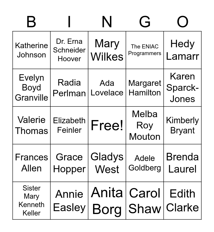 This bingo card has a free space and 24 words: Grace Hopper, Annie Easley, Ada Lovelace, Sister Mary Kenneth Keller, Hedy Lamarr, Katherine Johnson, Evelyn Boyd Granville, Dr. Erna Schneider Hoover, Melba Roy Mouton, Gladys West, Margaret Hamilton, Valerie Thomas, Adele Goldberg, Brenda Laurel, Radia Perlman, Carol Shaw, Kimberly Bryant, Mary Wilkes, Karen Sparck-Jones, Elizabeth Feinler, Edith Clarke, Frances Allen, The ENIAC Programmers and Anita Borg.