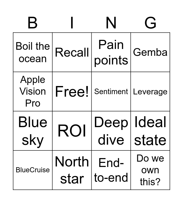 This bingo card has 16 words: North star, Ideal state, Pain points, Boil the ocean, Blue sky, Recall, Deep dive, End-to-end, Apple Vision Pro, Free!, BlueCruise, Gemba, ROI, Leverage, Sentiment and Do we own this?.