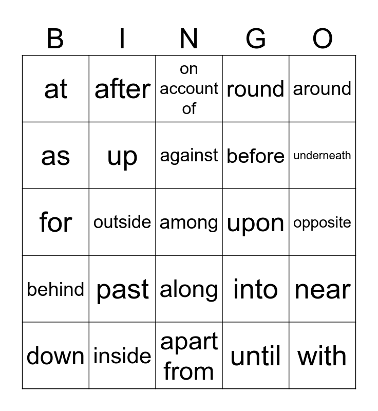 This bingo card has a free space and 63 words: Free!, about, above, near, across, of, after, off, against, on, along, onto, opposite, around, out, as, outside, at, over, before, past, behind, round, below, since, beneath, beside, through, between, to, beyond, towards, by, under, underneath, down, during, until, except, up, for, upon, from, in, with, inside, within, into, without, ahead of, inside of, apart from, instead of, as for, as well as, on account of, because of, on top of, due to, out of, except for, outside of and in front of.